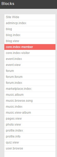 - You'll now see a listing of all of the block controllers in a menu to the left. The core.index-member controller is selected by default.