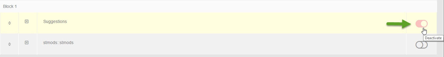 - Click the Disable (Deactivate) icon to the far right of the block you want to disable and it will change to Grey for disabled. It is best not to delete default blocks and to disable them instead of deleting. The image below shows an activated (Red) and deactivated (Grey) block. You can enable (activate) a block by clicking the grey icon and it will turn to red for enabled.