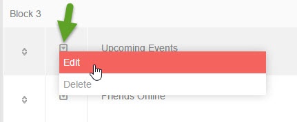 - Click the Edit arrow to the left of the block to edit it or click Delete to delete it. Note that it is not a good idea to delete default blocks. Please see the step for disabling a block instead.