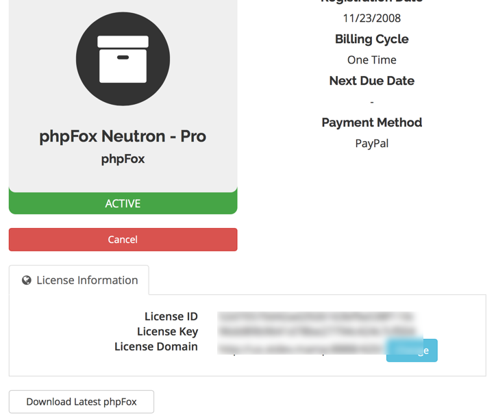 - Click your license you see in the list and you will be brought to the page that shows your license ID, Key, domain name and download link: