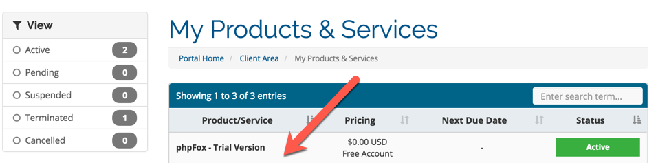 - Once you are in your account, you will see the "Your Active Services/Products" block: