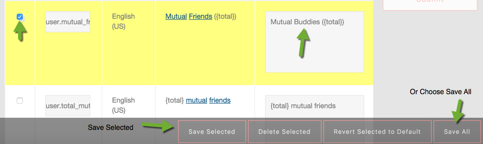 - Change Friends to Buddies in the right column (Text Column). Click to the left of the phrase in the checkbox and choose Save Selected or Save All (if editing more than one).