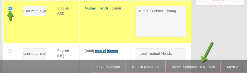 - If you need to revert the phrase back, just follow the steps to find your phrase and then click to the left of the phrase in the checkbox and choose Revert Selected to Default. Clear cache.