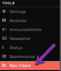 • On the right, you'll see a list of things to choose from for setting your Ban Filters: Usernames, Emails, Display names, IP addresses, and words.