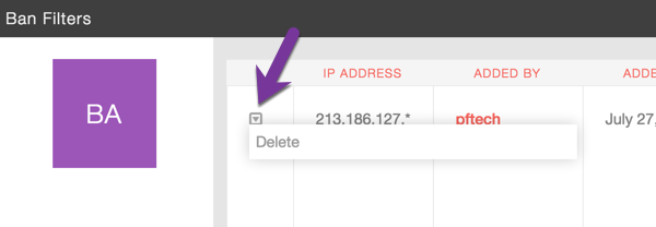 • Click the one you want to add a ban filter for. If you have some already, you'll see a list of banned things. If you don't have any, you'll see a box on the right to add a ban filter. For this example, we'll use a spammer IP address with wildcard filter to show you how to do that too.