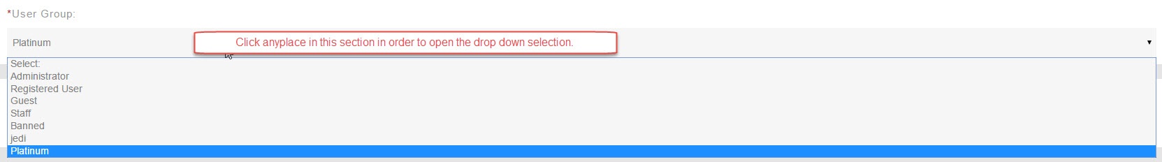 You will now see a lot of options for this user and you can change anything in this edit screen. However, this tutorial will just deal with moving the user. Scroll down until you see the selection for User Group and click to open the drop-down selection: