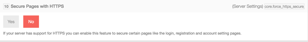 If your server has support for HTTPS you can enable this feature to secure certain pages like the login, registration, and account setting pages.