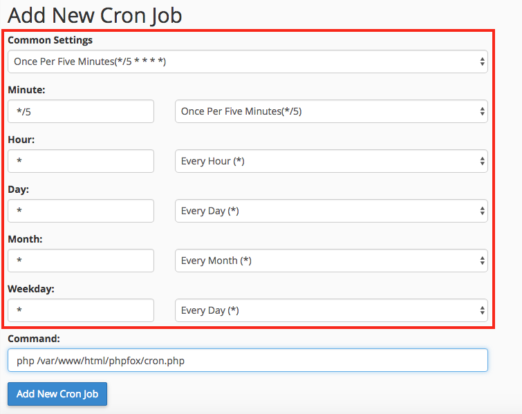 - Step 4: Select how often you wish the command to be run by selecting an option in each of the boxes or by selecting a predefined period from the Common Settings drop-down menu. We suggest running the cron job every 5 minutes.