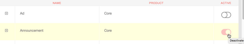 - You will now see a listing of default modules. The button to the far right will toggle it on (red) or off (grey).