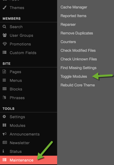 - Click Maintenance (found under Tools) and then select Toggle Modules.