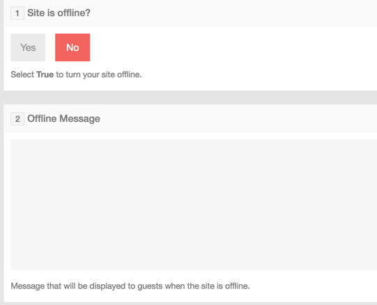 - Set Site is Offline to True or False depending on whether you are setting it offline or online. You can also add a custom message in the block for that.
