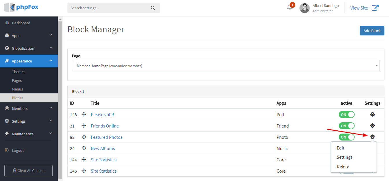 • Access to Blocks Manage page: go to AdminCP >> Appearance >> Blocks
