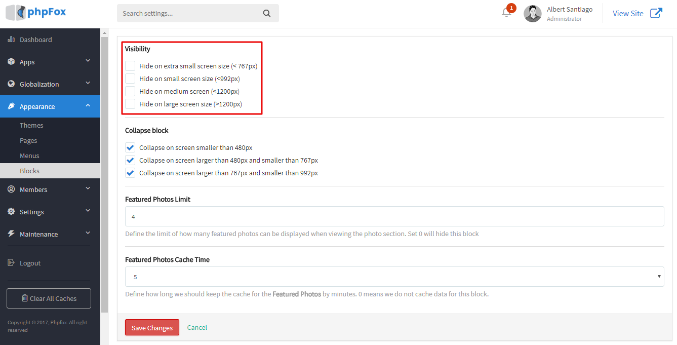 In version 4.6.0, we're glad to introduce a new layout: support settings for blocks. From now on, admin can decide which blocks will be shown/hidden on desktop, tablet or phone. Besides, they also can custom the blocks by updating some extra configurations (the configurations are depended on each block).