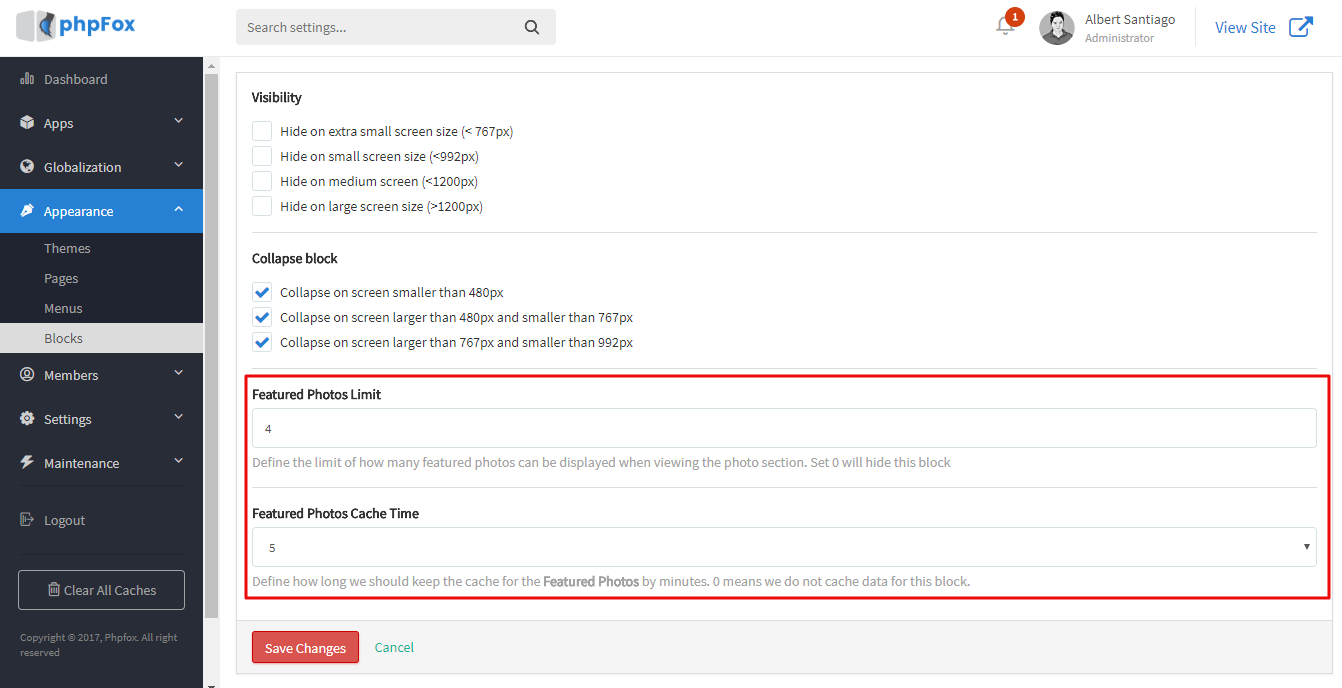 Example: below are settings of the block Featured Photos (new block of Core Photos app version 4.6.1)