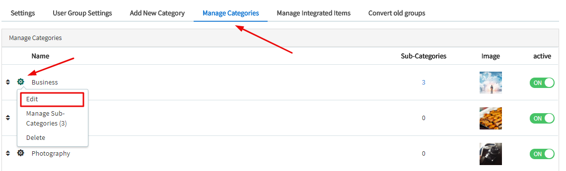 • In the Manage category tab, Click to the left of the category and select Edit and you can then edit the name and if a subcategory you can edit the parent category.
