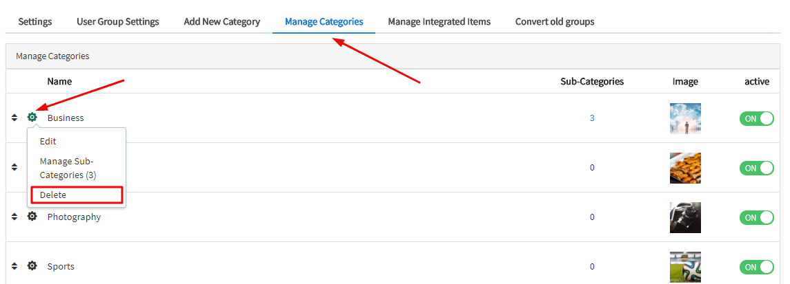 • Go to Manage Categories. Click setting icon to the left of the category and select Delete