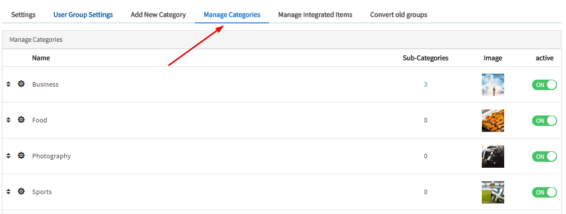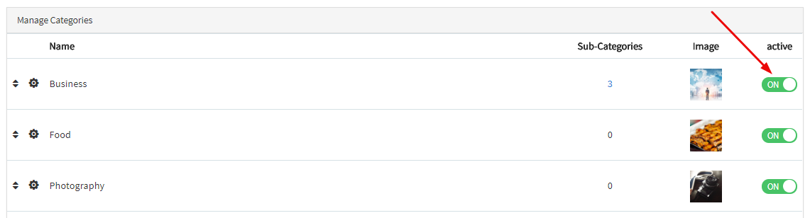• To the right of the categories, you will see a Green or Grey toggle button. Click that to enable and disable Categories.