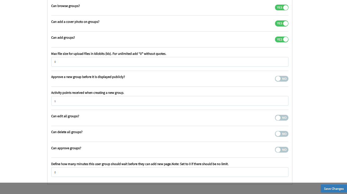 • Can add a cover photo on groups? -> Allows or disallows users in this user group to add cover photos to their Group.