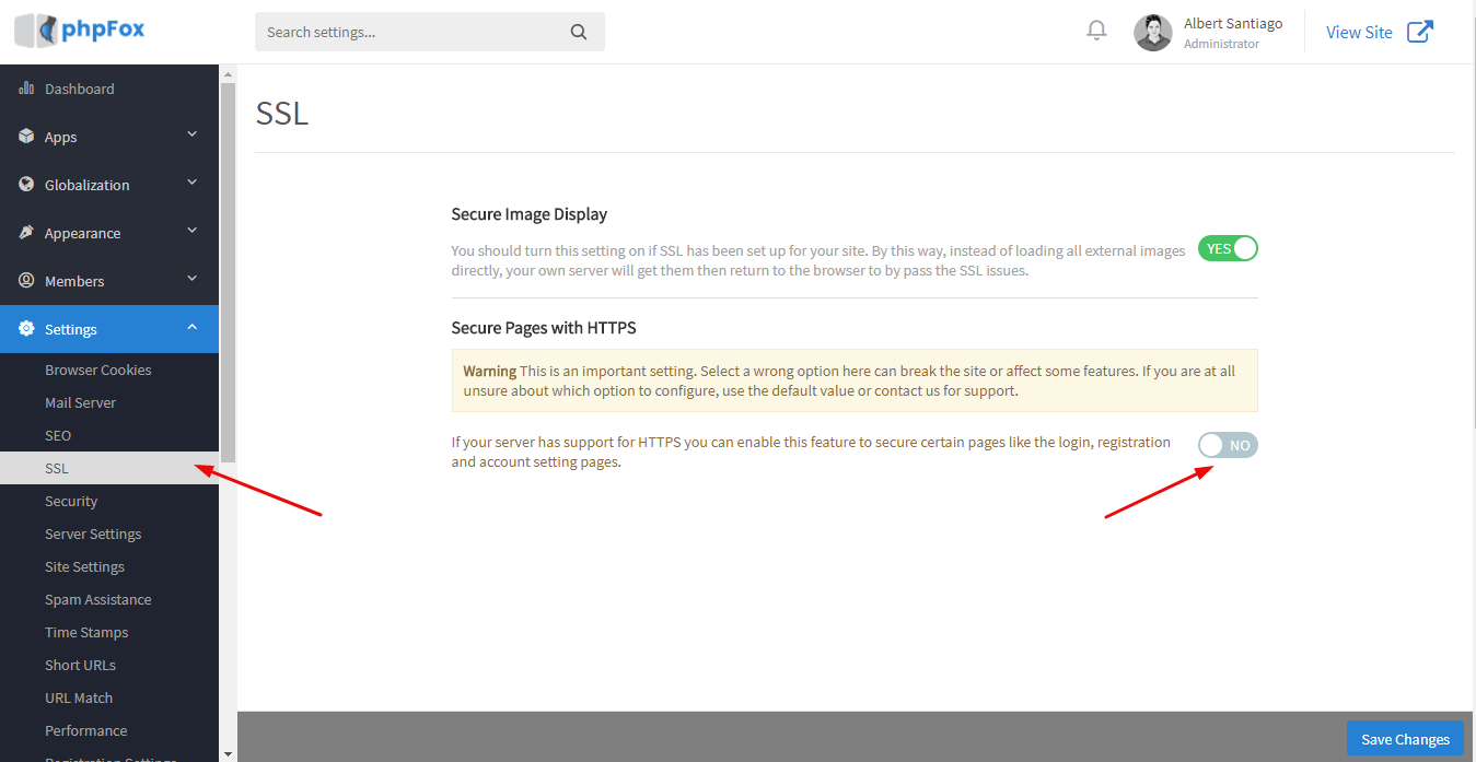 - Choose SSL from menu Settings. At Secure Pages with HTTPS setting, change it to Yes to enable HTTPS secure.