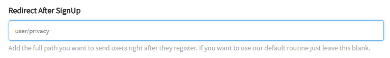 • Scroll down to the Redirect After SignUp and put your URL user/privacy if you want to redirect to the user privacy.