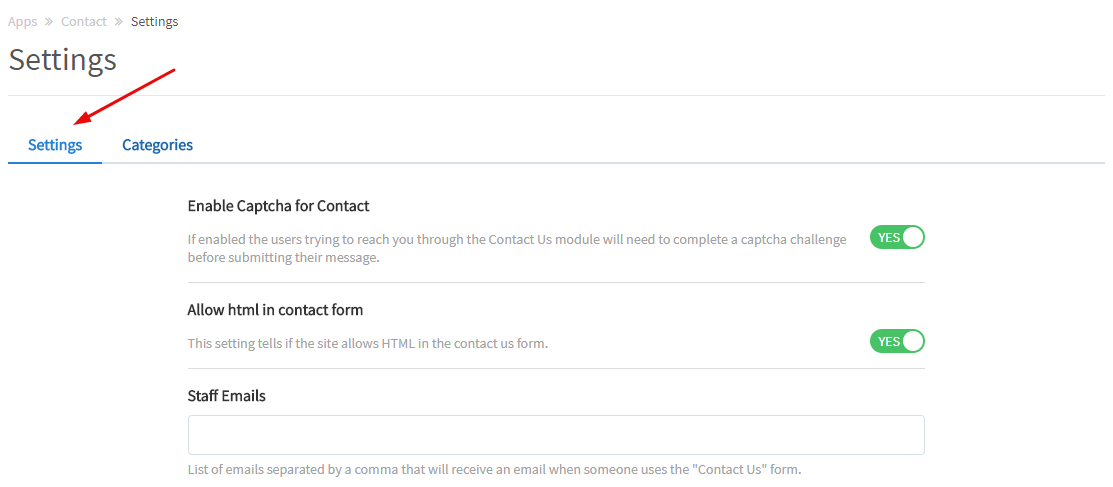 In the Settings section right before the Categories, you'd be able to see some settings as Enable Captcha, Allow HTML, and Staff Emails.