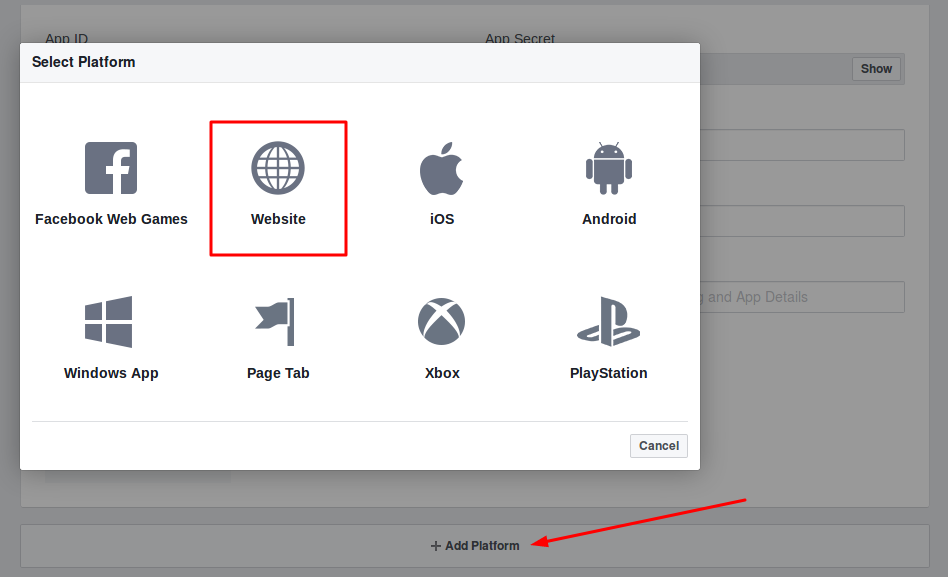 Scrolling down, select Add Platform and choose Website from the list on the popup.