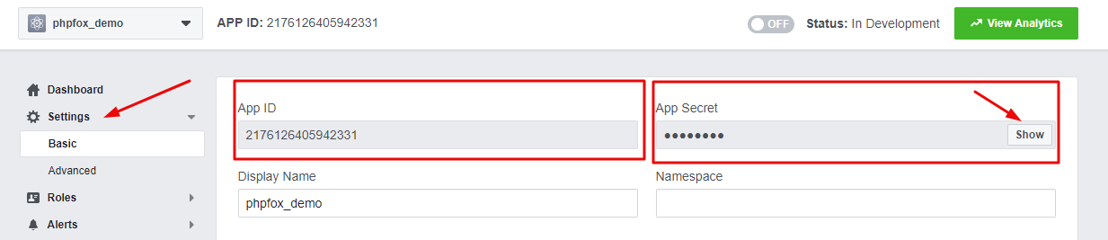 On Setting content, you will see App ID. Click on Show button to reveal App Secret. Now you already have both App ID & App Secret to use with Facebook Connect app. However, you need to configure your Facebook app a bit more to make it fully work.
