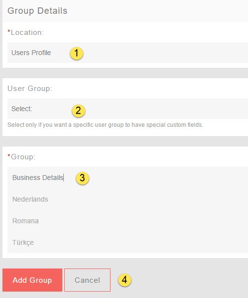 - Name: Put a name for this group. If you have other languages installed, be sure to put the name in those too. In our example, we put this one as Business Details.
