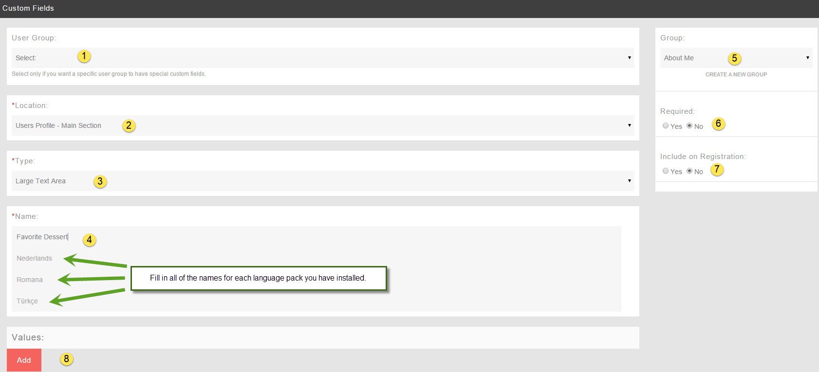 - Name: This is what the user will see so be sure to put a good name for it. You'll want to fill in any other languages you have too. In our example, we used Favorite Dessert for this custom field.