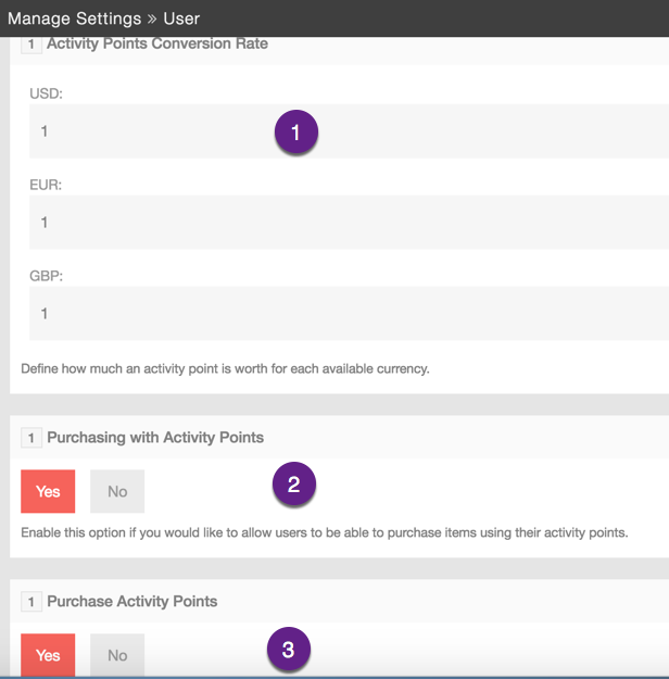 - Purchasing with Activity Points - Yes to allow users to purchase with points and No will disable this feature.