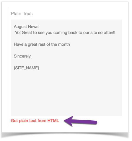 - Plain Text - You can either manually enter this or click to get the plain text from the htmlHTML.