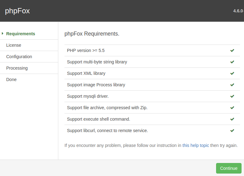 Now, you will need to open the browser with your domain (For example http://domainsite.com) to start the installation script. In the first step, the system will check all the requirements in order to run the script. You can see check (√) signs when if passed and (X) if your system doesn't meet the requirements.