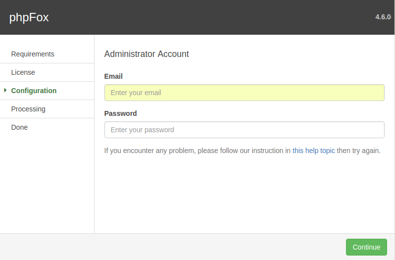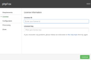 Next step, the following form will show for you to enter your phpFox License ID & Key, which was sent to you via an email directly after your purchase.