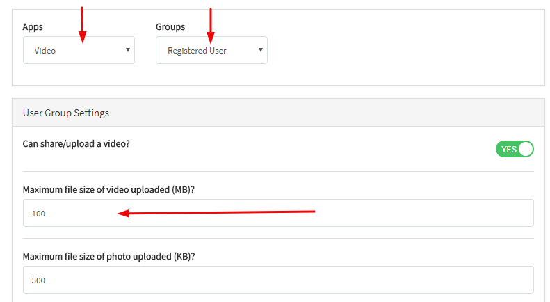 By default, the script maximum video file size under the Registered User is 10MB. You can change this value to any value you want. In this case, let's try to change it to 100MB so that all the Registered Users belong to this UserGroup can upload videos up to 100MB.