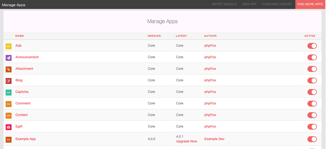 page will list all installed apps on your site (both Core apps and Third-party apps)