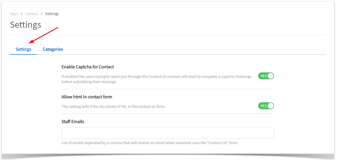 before the Categories, you'd be able to see some settings as Enable Captcha, Allow HTML, and Staff Emails.