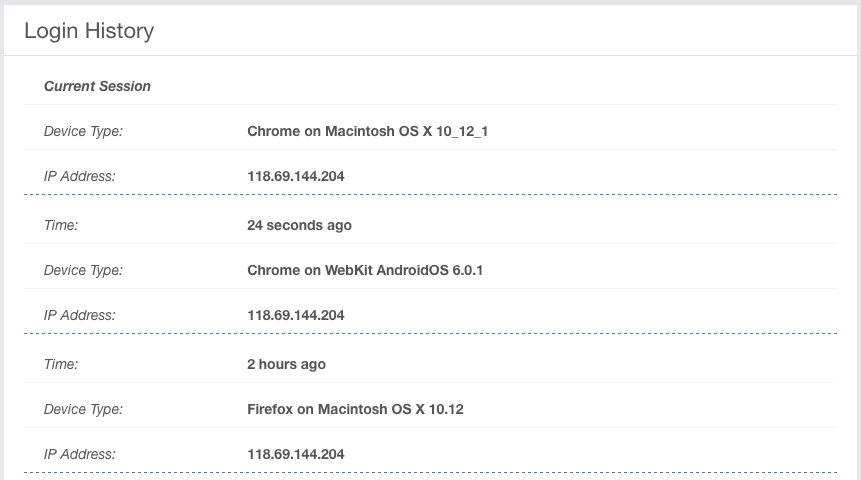 - While viewing login history, user can block devices, set IP to trusted list or block IP address