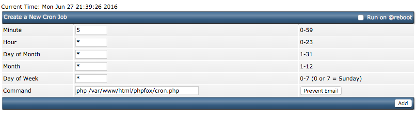 - Step 3: Add the command below to the list to add the phpFox cron job. (<path_to_phpfox_root_dir>/cron.php is the PATH we received in first step). With this command, the phpFox cron job will be executed every 5 minutes.