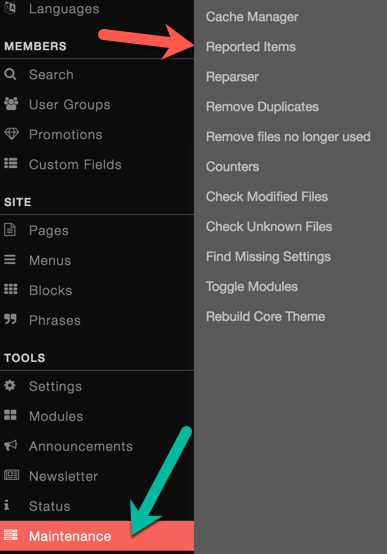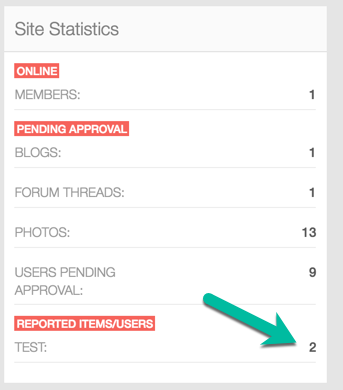 When you first log into AdminCP, on the right you will see a Statistics block. At the bottom of the list of items will be the Reported Items. You can click the number to go to the Reported Items page.
