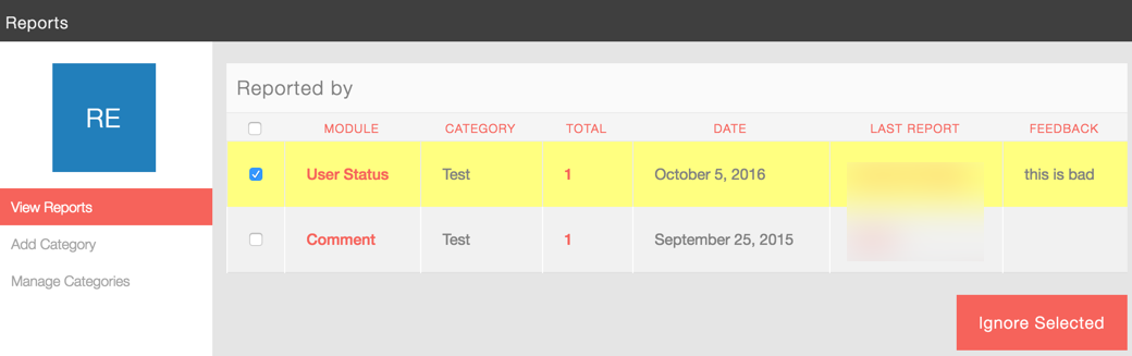 The View Reports screen shows you the items reported, report category, how many reported it, date reported, who reported it, and feedback.