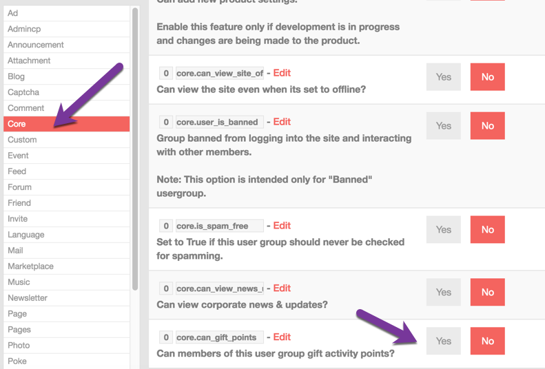 If you want to allow your users to Gift Points to their friends, you first need to enable it for each user group you want to allow. Follow the tutorial for how to manage user group settings to get to the settings area. Once at the user group area, select the group you want to enable and do the following for each group you want to be able to gift points.