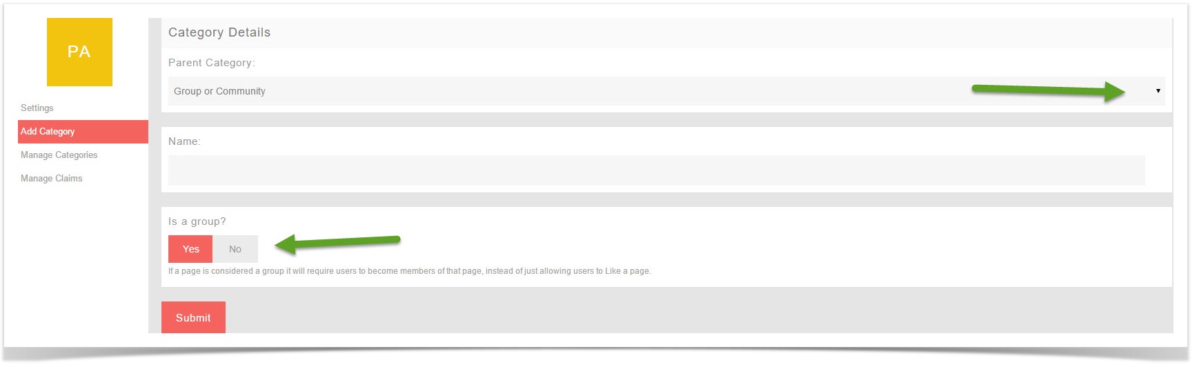 When making the main categories there is no select to make this for a Group or a Fan Page. You would do that in the sub-categories. More on that later in the tutorial.