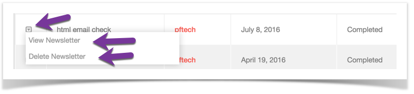 - To the right, you will see your archived Newsletters with an arrow to the left of each one. Click the arrow and you can select to View or Delete the newsletter.